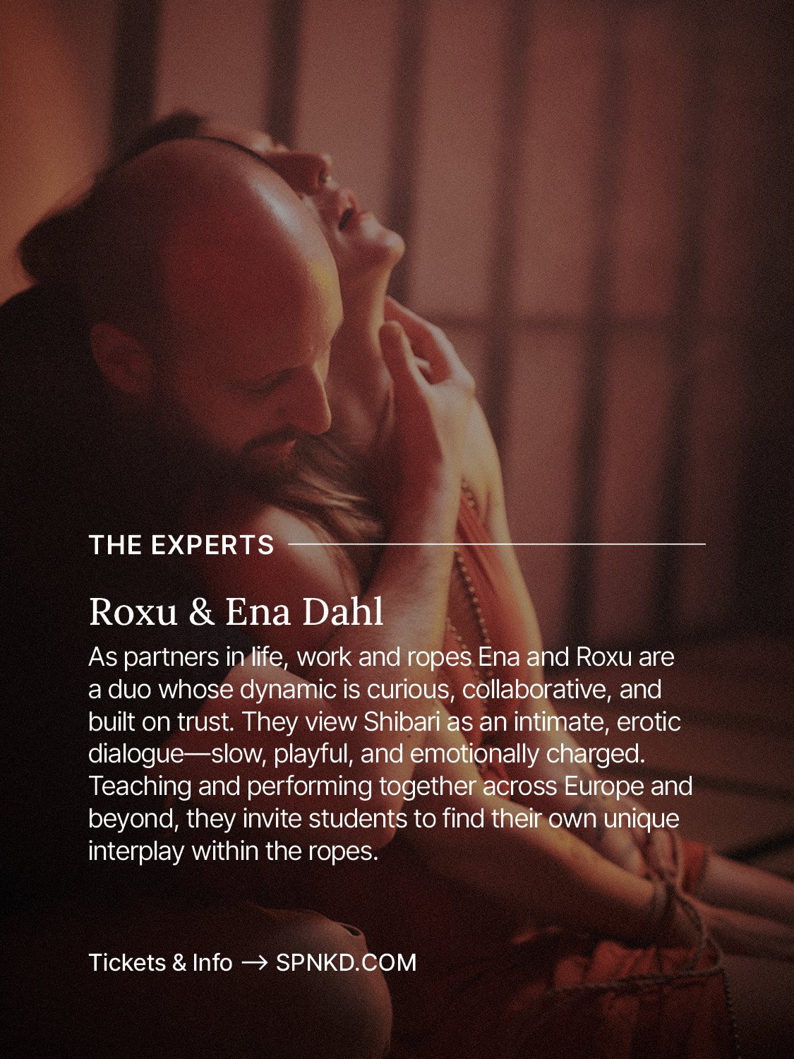 Led by Ena Dahl & Roxu, partners in life and rope, who bring a playful, emotionally charged approach to Shibari as intimate conversation.