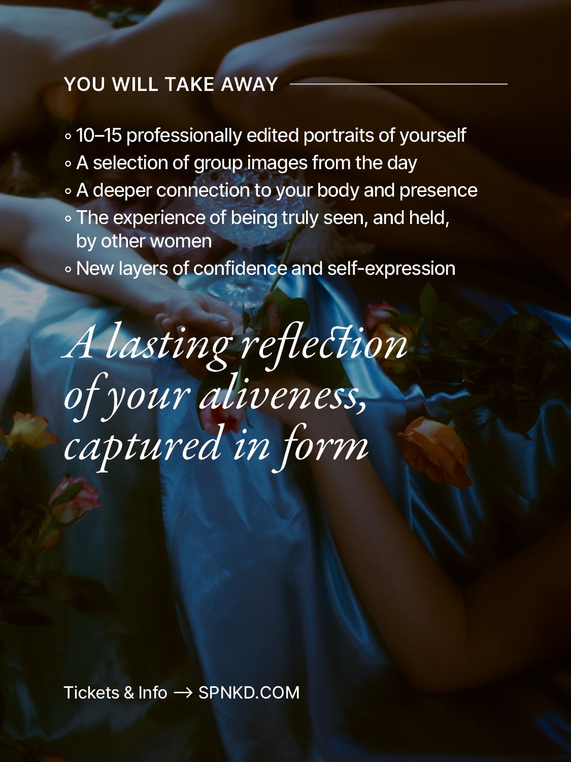 Because you are both: a Work in Progress and a Masterpiece. By the end of this journey, you will feel more connected. More alive. More magnetic. A living work of art. You will hold photographs that remind you of your aliveness.